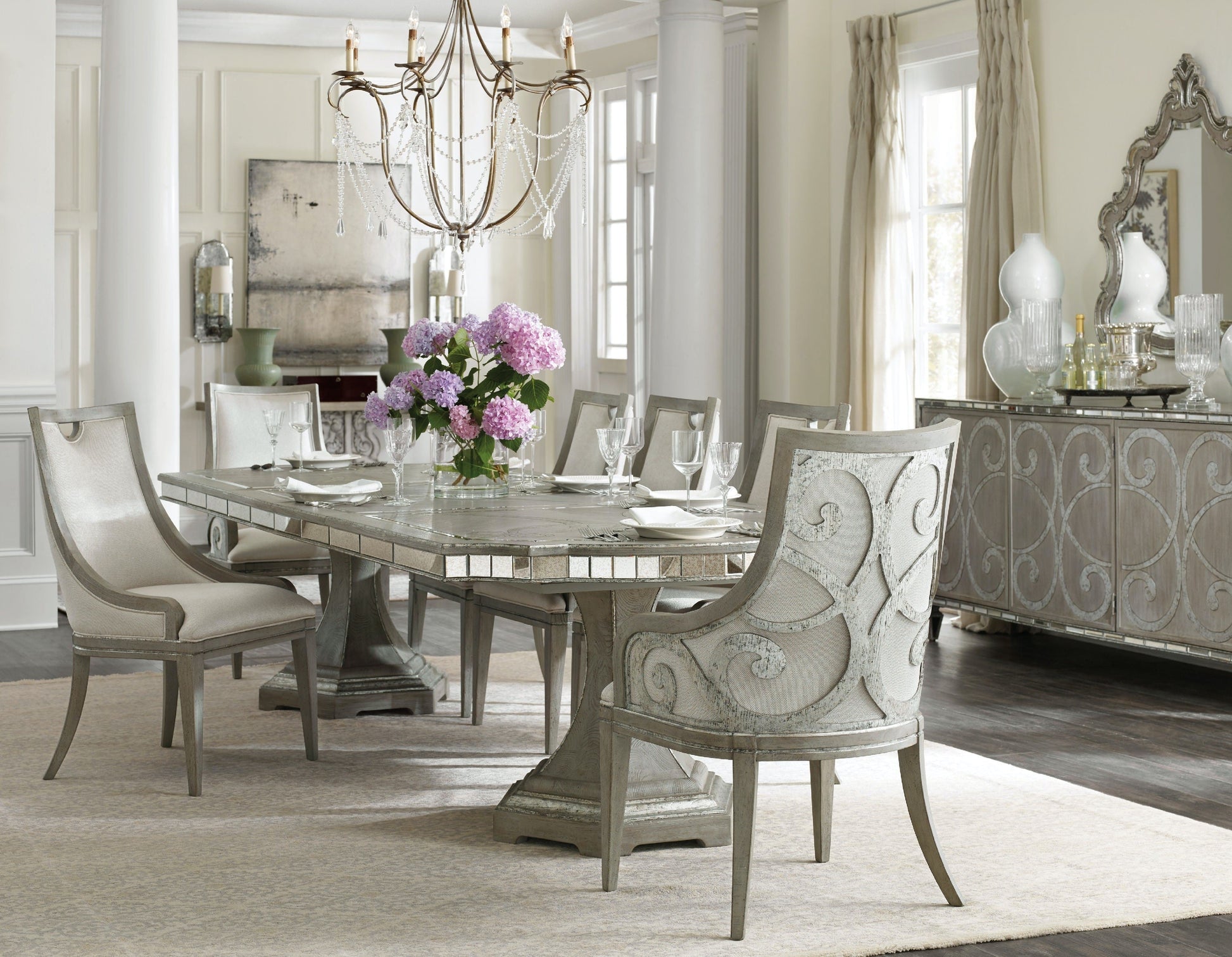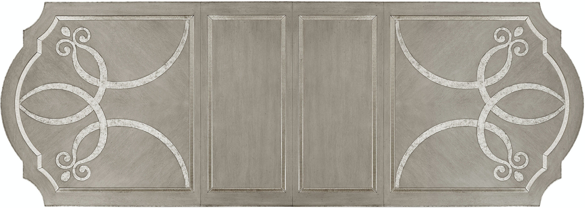 Make every dining gathering a luxe experience with this opulent dining table featuring exquisite scrolled inlays on the top and a mirrored apron. Finished in Epoque, a greige with shimmer on Oak veneers with mirrored accents. Seats 10 guests and extends to 128 inches with both leaves in place.