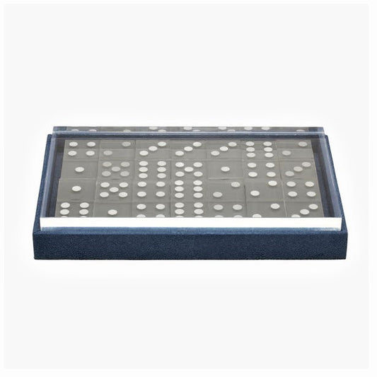 Faux shagreen domino set with resin pieces and a clear acrylic top, in sand color.